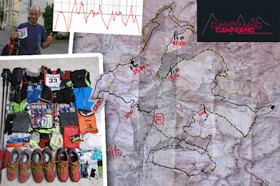 Un dorsal, el 33, mi número de la suerte; un perfil, un mapa con el estudio de tiempos, desnivel y bases de vida, y un equipo para las 29 horas que estuve corriendo día y noche.